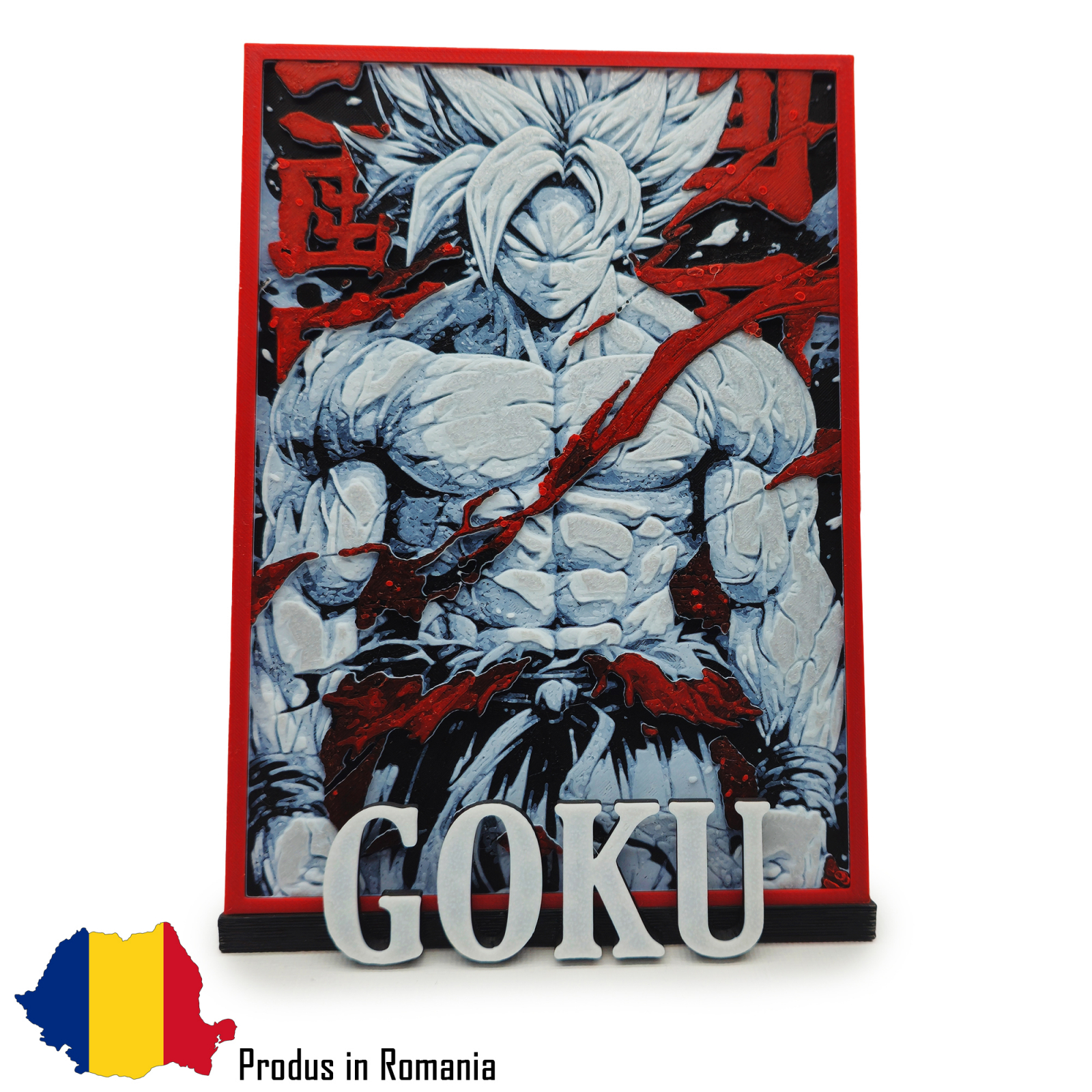 • Detalii În Relief: Fiecare element este realizat cu o atenție deosebită, evidențiind expresia fermă a lui Goku, detaliile hainelor sale rupte și postura sa eroică, aducând astfel o adâncime vizuală impresionantă.
