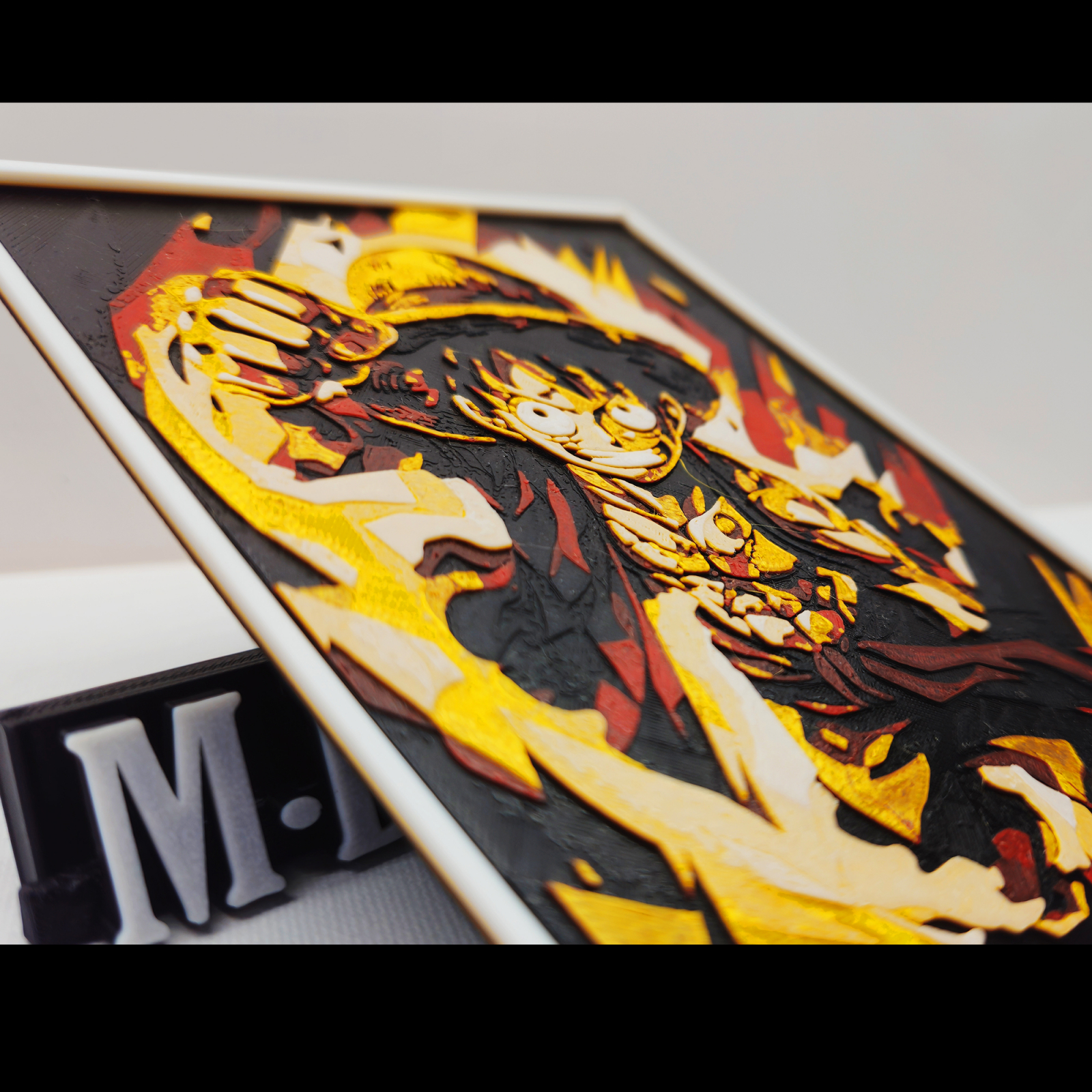 • Detalii În Relief: Fiecare detaliu este realizat cu precizie, evidențiind expresia fericită a lui Luffy, pălăria sa iconică și caracteristicile unice ale costumului său, aducând o profunzime vizuală atrăgătoare.